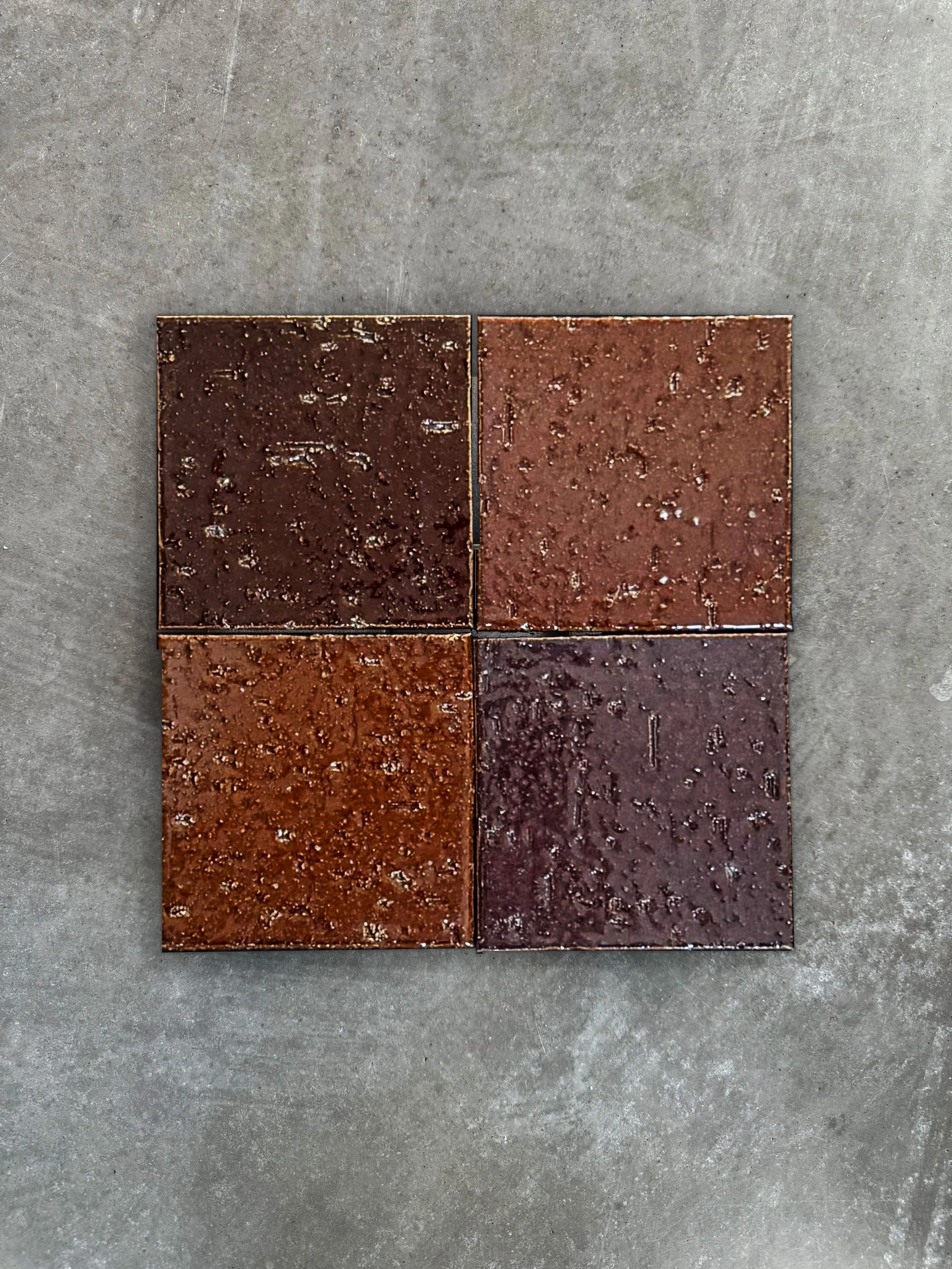 YUMI tiles transform surfaces into a canvas of colour and depth. Their square form and rich Saddle Red glaze create an interplay of warm tones that shifts with light, giving walls and floors a quietly dynamic presence.